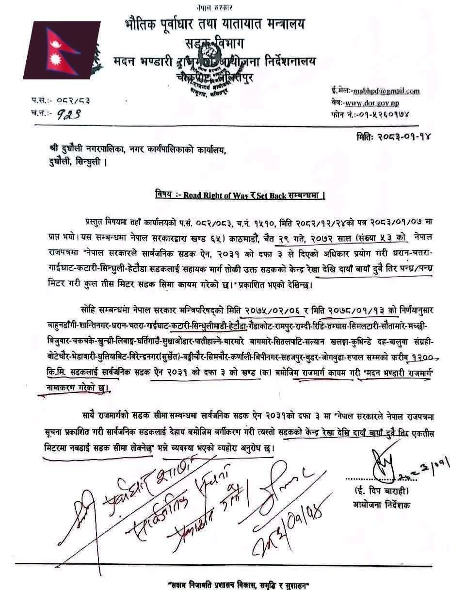 मदन भण्डारी राजमार्गको सडक सीमा ३१–३१ मिटर कायम गर्न निर्देशन